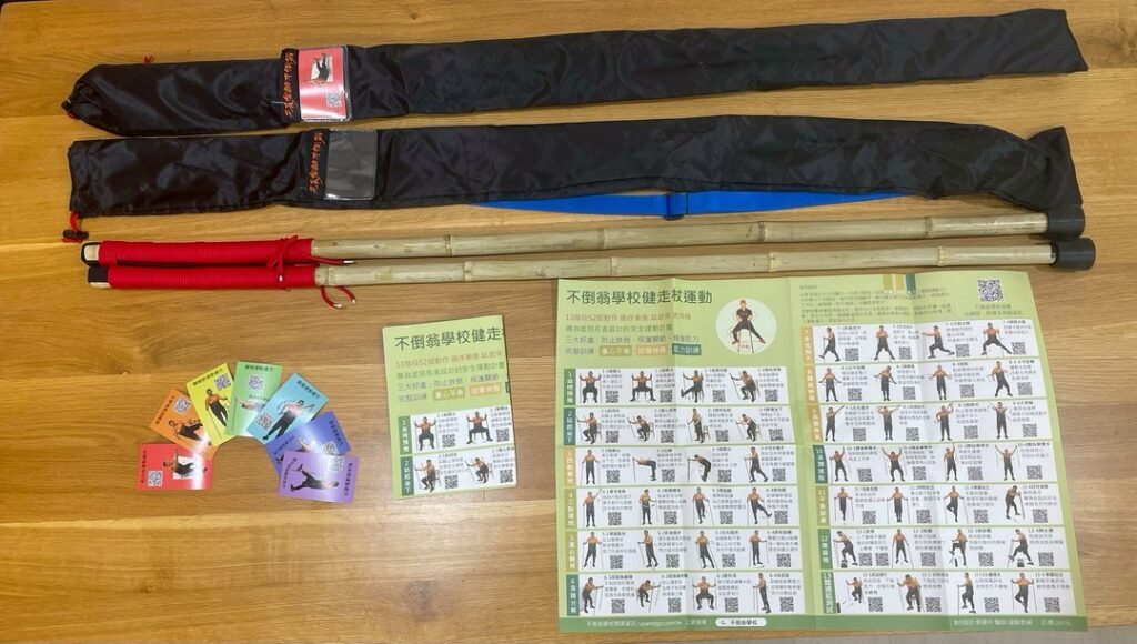 是郭健中醫師為走路不穩,肌少症的虛弱長者而設計,用兩根健走杖支撐,站起來,在原地運動,避免依賴輪椅。2018年成立不倒翁學校,在社區、居家及醫療安養機構,用更安全簡便的方式,推廣健走杖運動課程,設計各種輔助教材及適合特殊族群的健走杖運動處方及線上課程影片。使用各種杖都可以,包括登山杖、北歐健走杖、日式健走杖,甚至用桂竹自製健走杖。鼓勵指導員將健走杖結合各項運動訓練,如健走杖瑜珈、健走杖正念氣功,水中健走等,應用到居家復能、健身運動、旅遊與森林療癒,社區健走小旅行。